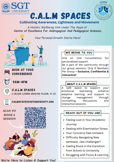 At SGT University, we recognize that learning extends beyond academics to include emotional resilience, adaptability, and psychological well-being. With this vision, the Centre of Excellence for Andragogical and Pedagogical Sciences (CEAPS) proudly introduces C.A.L.M Spaces—a sanctuary designed to support students in navigating academic pressures, personal challenges, and evolving learning methodologies.