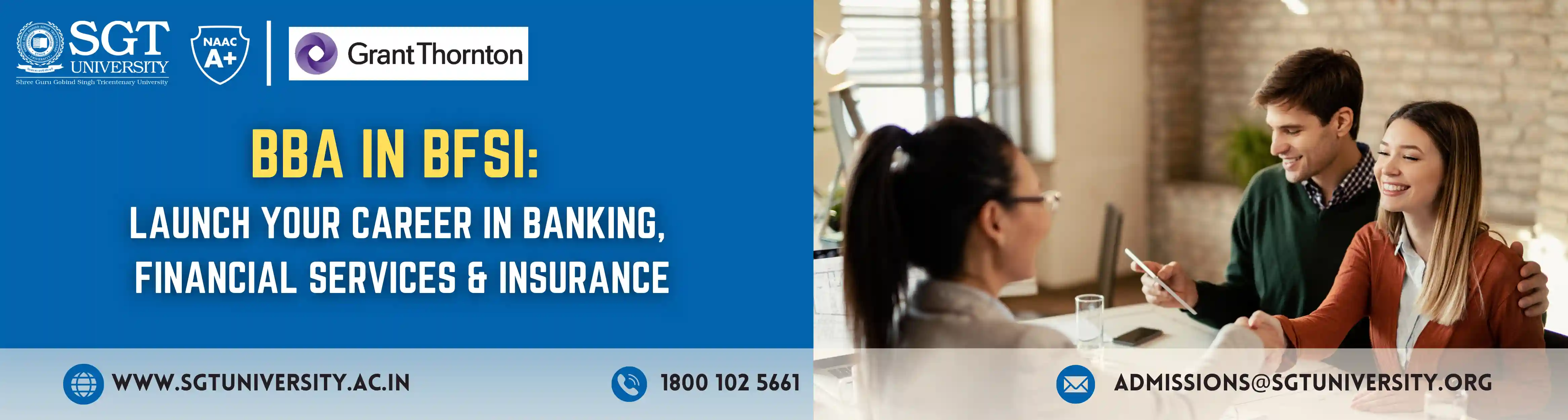 SGT University, Gurugram, a NAAC A+ accredited university, provides you with the best career in banking, financial services, and insurance under the school of Commerce and Management, which also has an academic partnership with Grant Thornton. It is a 3-4 year undergraduate program called Bachelor of Business Administration in Banking, Financial Services, and Insurance.