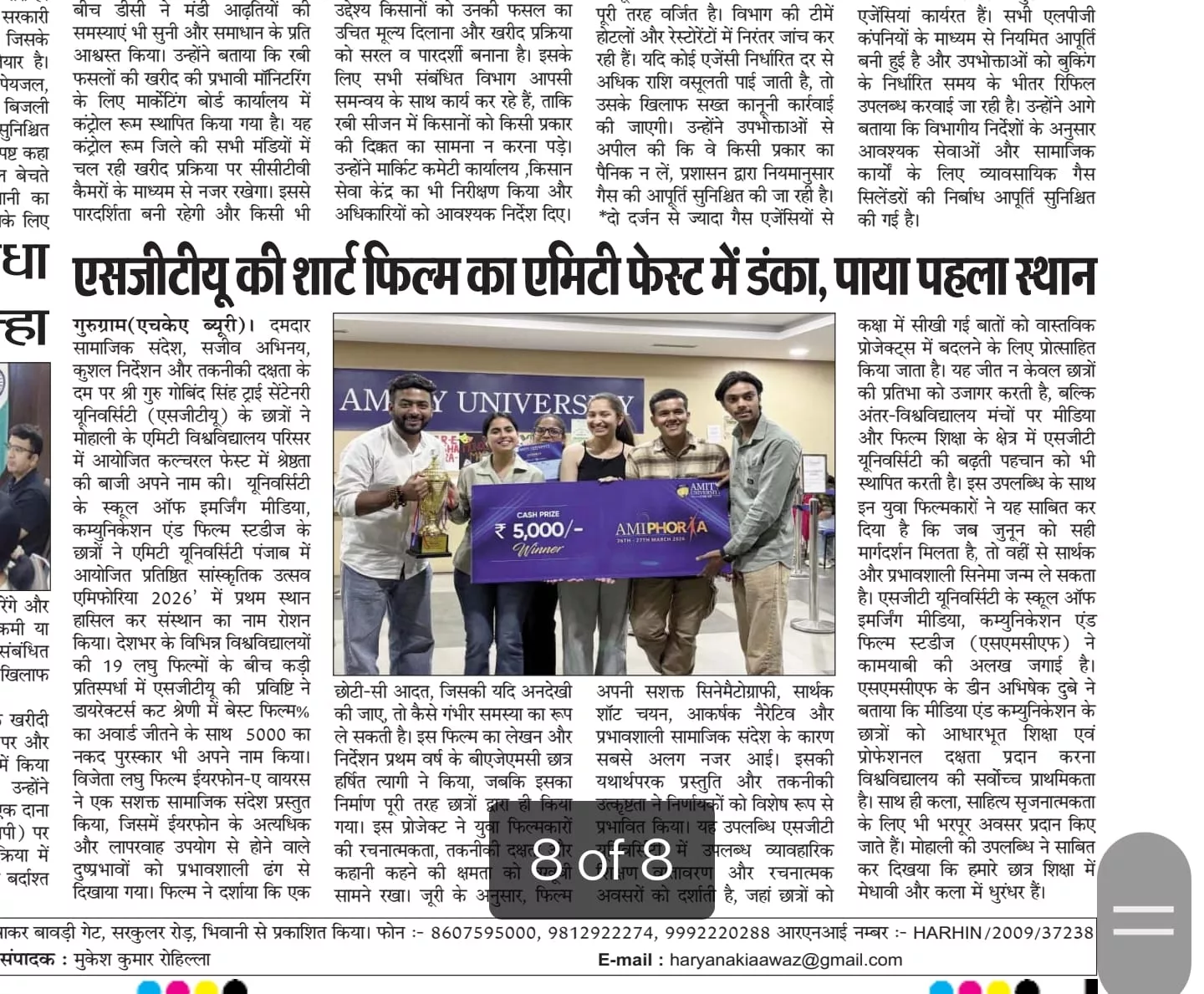 Students from the School of Emerging Media, Communication & Film Studies (SMCF), SGT University, brought laurels to the institution by securing a remarkable victory at 'Amiphoria 2026', the prestigious cultural fest hosted by Amity University Punjab, held on 26–27 March 2026 in Mohali.