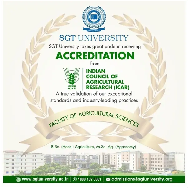 It sets high standards of excellence and provides recognition to institutions that meet their rigorous criteria. SGT University’s achievement of ICAR accreditation for two of its courses: B.Sc. Hons. Agriculture and M.Sc. Agriculture (Agronomy) is a proud testament to our commitment to meeting ICAR criteria.