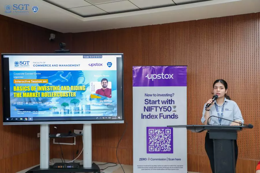 The Corporate Connect Centre, School of Commerce and Management, SGT University, organized an insightful session on September 09, 2025, aimed at enhancing financial literacy and helping students understand the dynamics of capital markets and investments.