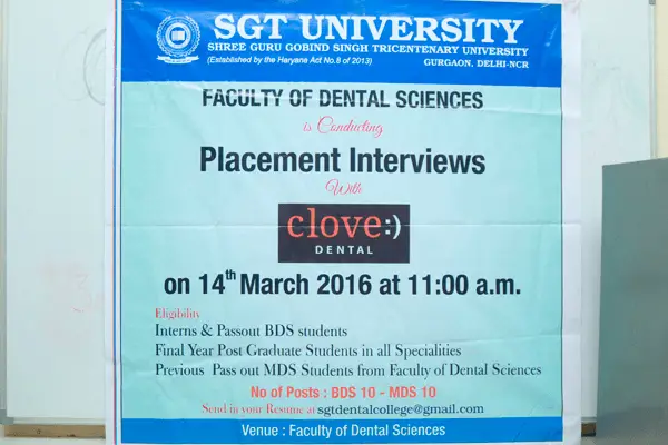 The delegates from Clove india limited visited SGT University Campus, faculty of dental sciences on 14th march 2016 for placements of Exam going MDS students and all pass out MDS and BDS students for their dental clinics across NCR. It was highly appreciated by the Students for being the only institution giving them an opportunity to get their jobs secured even before their exams.