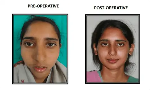A PATIENT NAMED KOMAL , 21 YEARS FEMALE REPORTED TO THE OUTPATIENT DEPARTMENT OF ORAL AND MAXILLOFACIAL SURGERY OF FACULTY OF DENTAL SCIENCES, SGT UNIVERSITY GURGAON WITH A CHIEF COMPLAINT OF EXCESSIVELY PROMINENT CHIN AND PROTRUDED LOWER LIP SINCE LAST 6 YEARS. EXTRAORAL EXAMINATION REVEALED MESOCEPHALIC HEAD AND MESOPROSOPIC FACIAL FORM WITH A CONCAVE FACIAL PROFILE. THE PATIENT PRESENTED WITH A GROSS FACIAL ASYMMETRY WITH SUNKEN CHEEKS, REDUCED MALAR PROMINENCE, A DEEP MENTOLABIAL SULCUS AND AN ANTERIORLY DIVERGENT FACE. LIPS WERE COMPETENT. ON INTRAORAL EXAMINATION, A CLASS III MOLAR RELATION WAS SEEN WITH AN INTERINCISAL OPENING OF 42 MM AND MIDLINE SHIFTED TO THE LEFT SIDE. A HYPOPLASTIC UPPER LIP WITH DEVIATION OF JAW TO LEFT SIDE WHILE CLOSURE OF THE MOUTH WAS SEEN.