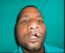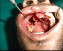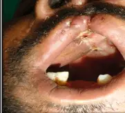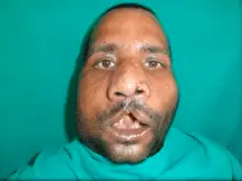 HE THEN REPORTED TO OUR DEPARTMENT WHERE MICRO-VASCULAR RECONSTRUCTION WITH FIBULA GRAFT WAS PLANNED FOR THE RECONSTRUCTION OF PALATE AND MAXILLA ON RIGHT SIDE. HE ALSO HAD LEFT PARASYMPHYSIS FRACTURE AND MALUNITED LEFT CONDYLE. A TEAM OF EMINENT SURGEONS INCLUDING DR.