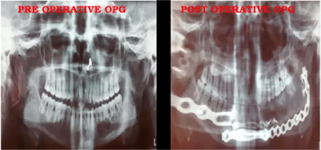 PATIENT UNDERWENT SEGMENTAL RESECTION OF THE MANDIBLE AND RECONSTRUCTION USING ILIAC CREST GRAFT ALONG WITH RECONSTRUCTION PLATE UNDER GENERAL ANESTHESIA. THE RESECTED SEGMENT WAS SENT FOR HISTOPATHOLOGICAL EXAMINATION. POST –OPERATIVE RESULTS ARE PROMISING. NOW SHE IS UNDER OBSERVATION OF FOLLOW UP PHASE.