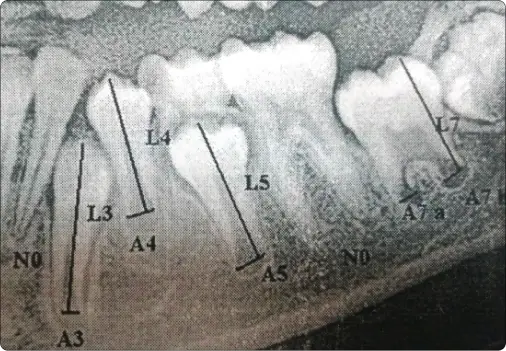 Several measurements like pulp-root length, pulp-tooth length, tooth-root length and pulp-root width of six suggested teeth were made on peri-apical radiographs. The mean value of the measured ratios were derived and substituted in the given regression formulas to derive dental age.