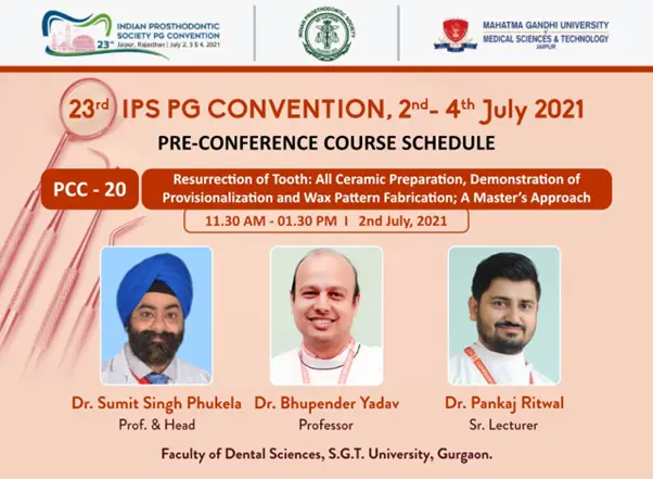 Dr. Sumit Singh Phukela ,Bhupinder Yadav, Dr. Pankaj Ritwal conducted Pre Convention Course In 23nd Indian Prosthodontic Society Pg Convention Jaipur On2ndJuly 2021 On Topic Resurrection Of Tooth ;All Ceramic Preparation ,Demonstration Of Provisionalisation And Wax Pattern Fabrication; A Master's Approach