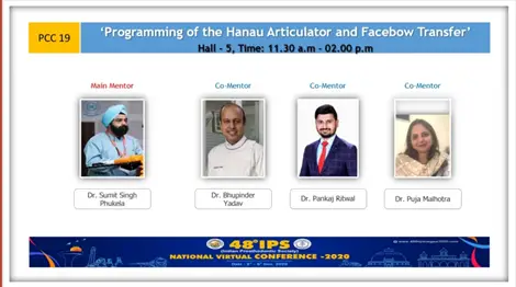 Dr Sumit Singh Phukela,Dr Puja Malhotra ,Dr Bhupender Yadav and Dr Pankaj Ritwal, Faculty members from Department of Prosthodontics Faculty of Dental Sciences SGT University conducted Pre convention course (online ) in 48th Indian Prosthodontics Society National Virtual Conference on 3rd December 2020 on topic Programming of Hanau Articulator and Facebow Transfer. 100 post graduate students registered for the course.The program was graced by IPS President Dr J.R. PATEL, IPS Secretary Dr Rupesh PL and Organizing chairman Dr Usha Radhke The interactive session gave an opportunity to the students to learn about Hanau Articulator and Facebow transfer. It was an enlightening,motivational and much appreciated experience for the Post Graduate students studying Prosthodontics from across the country.