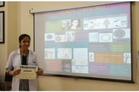 Dr. Charu Khurana, 2nd year post graduate student in the department of Public Health Dentistry was awarded with First Prize in Poster Presentation âGenetic Dentistryâ on 13th march 2015 in CDE programme organised by Department of Oral Medicine And Radiology, Faculty of Dental Sciences, SGT University, Gurgaon.