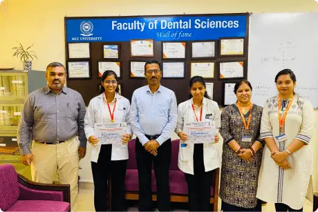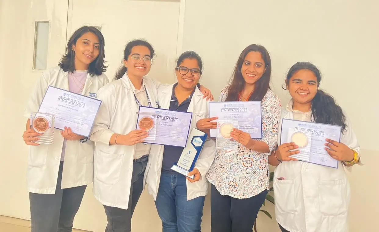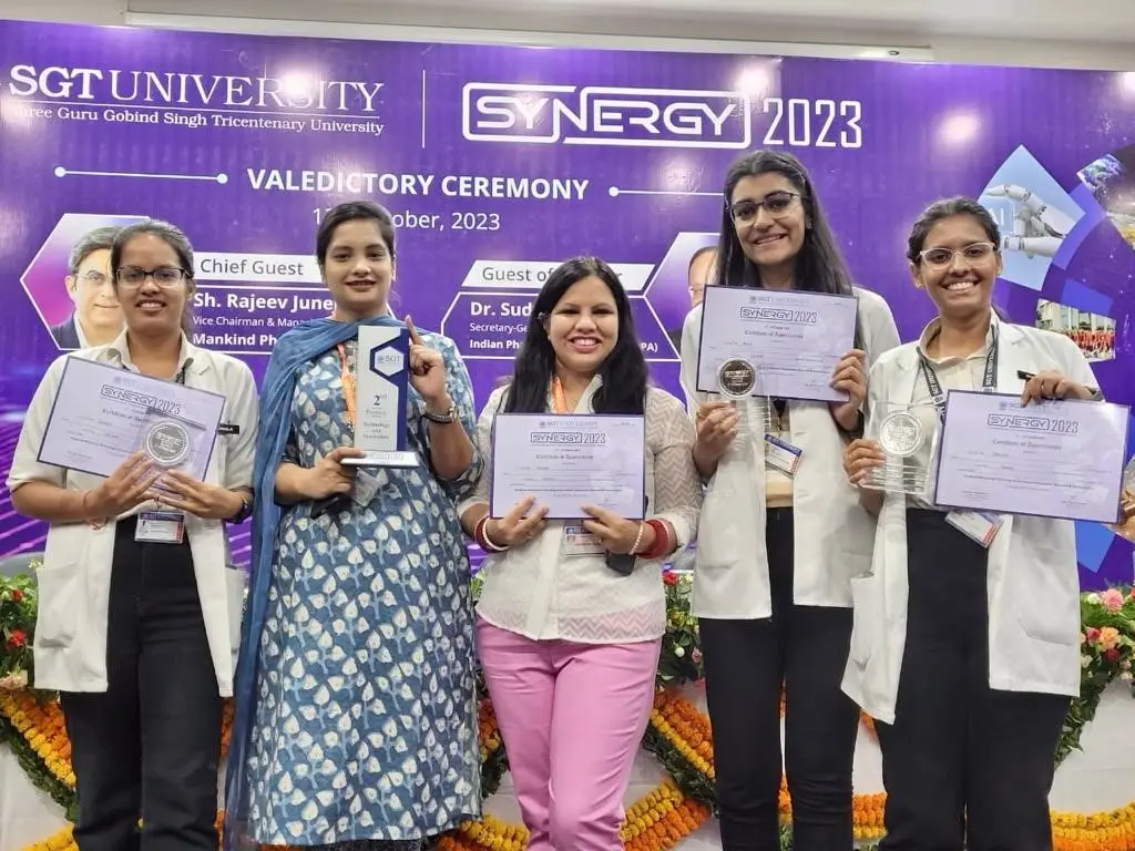 The principal investigator Dr. Surbhi Priyadarshi and co-principal investigator- Dr. Shourya Tandon and Dr. Meenakshi Chopra along with student team members comprised of â Aditi Mann (Intern, BDS), Surbhi Singla (Final Year, BDS), and Sakshi Yadav (Final Year, BDS) were awarded with 2nd prize for their novel concept of "chewing cleaners" - biodegradable and edible chewing films designed to clean and freshen oral cavity at Synergy Event organized by SGT University from November 11th - 13th October 2023.