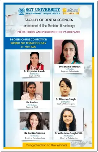 The Faculty members and post graduate students from the department of Public Health Dentistry participated in webinars and online competitions on the occasion of World No Tobacco Day 2020. All post graduate students participated and submitted a video highlighting the different aspects of tobacco use in IEC competition organized by Indian Association of Public Health Dentistry. AnE-poster competition was organized by department of oral medicine and radiology, SGT university and theme for the competition was âprotecting youth from tobacco useâ. Dr. priyanka presented on âpandemic: an unexpected opportunity to reform habitsâ; Dr.Aanchal presented on âhazardous effects of tobaccoâ; Dr. Ankita presented on âtobacco cessation-need of the hourâ; Dr. Prerna presented on âlegal and legislative implication in tobacco cessationâ. Dr. Priyanka got the second prize in e-poster competition.