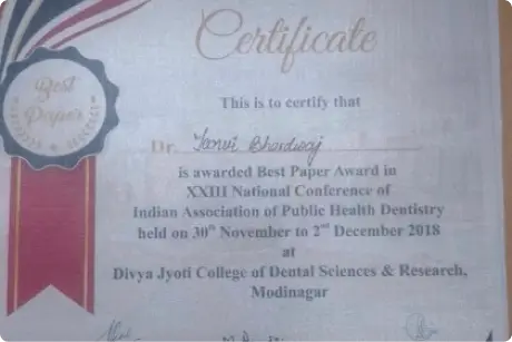 Dr. Tanvi Bhardwaj participated and won second Prize in Poster Making Competition on 1st Dec 2018 on Knowledge, Attitude And practice regarding preventive care among private dentists in Gurugram city at 23rd IAPHD National Conference, Modinagar.