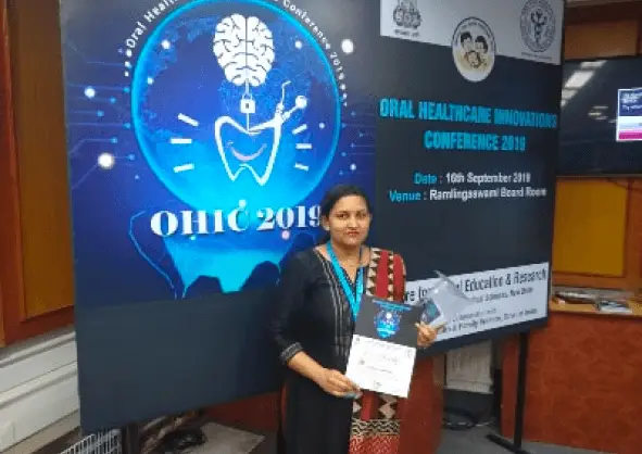 Dr. Sonia Raina got the first prize for her paper on topic âAssessment of Oral Health and Nutritional Status Among School Childrenâ presented at 23rd National Conference of Indian Association of Public Health Dentistry held at Divya Jyoti Dental College and Research Centre, Modinagar from 30th December to 2st December, 2018