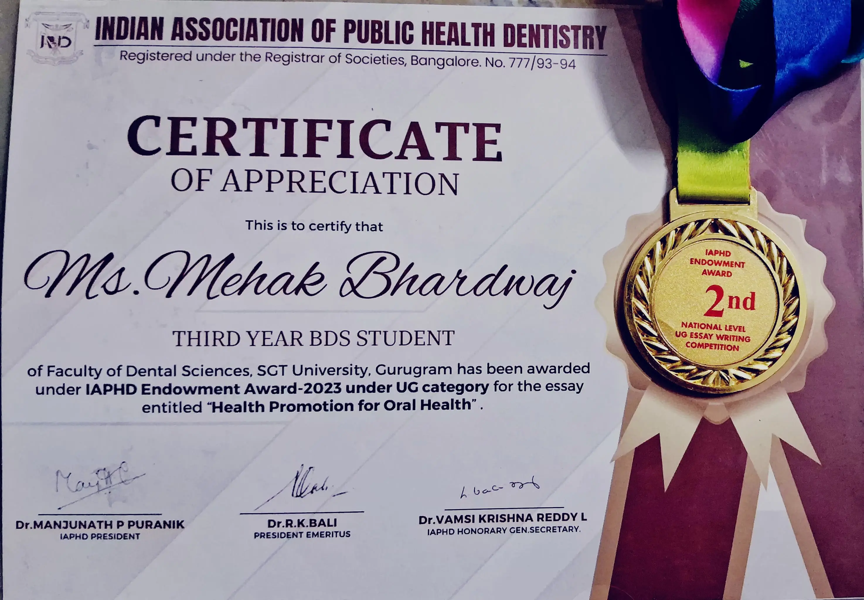 Delighted to proclaim that Mehak Bhardwaj, a BDS final-year dental student, secured second place in the National Level Essay Competition for undergraduate students under IAPHD endowment award UG Category organized by Indian Association of Public Health Dentistry (IAPHD) in November 2023. Her journey to success was elegantly guided by her mentor, Dr. Charu Khurana (Associate Professor) in the Department of Public Health Dentistry. The theme of the essay focused on âHealth Promotion for Oral Healthâ.