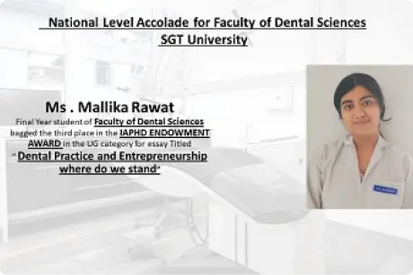 Professional bodies have a great role in shaping the future of young professionals and upcoming students. Indian Association of Public Health Dentistry organises various events for UG and PG category ranging from research, outreach, academic achievement and essay competitions. Ms Mallika Rawat, final year student of Faculty of Dental Sciences took part in the National level essay competition and expressed her views in the form of an essay titled âDental Practice and Entrepreneurship - Where Do We Standâ. Among 200 entries all over India, in the UG category she bagged the third place in the âIAPHD ENDOWMENT AWARDâ and brought laurels for the Faculty and University at a National level. Such accolades instill great pride for the university and faculty and inspire other students to aim for glory.