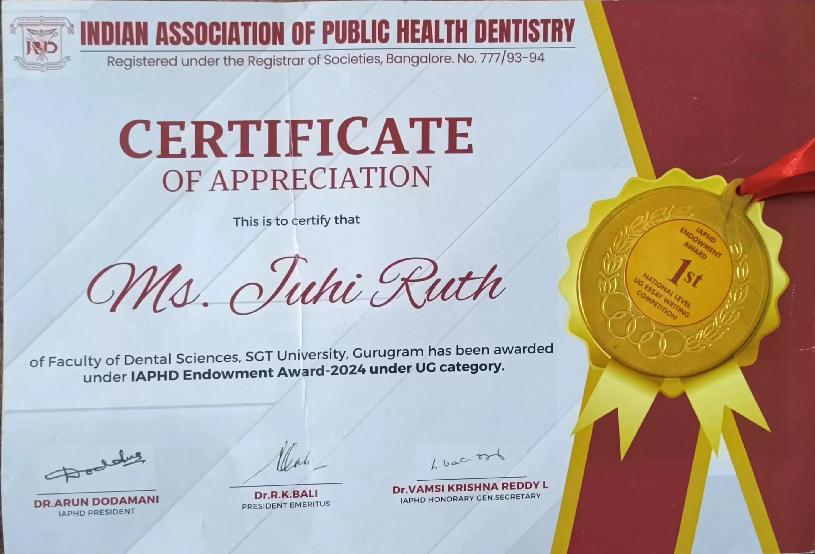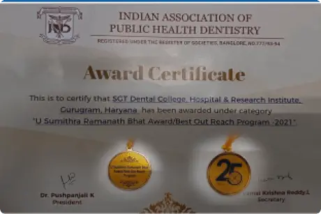 "U Sumithra Ramnath Bhat Award" for Best Outreach Programme by Indian Association of Public Health Dentistry(IAPHD) awarded to Department of Public Health Dentistry, SGT Dental College, Hospital and Research Institute, SGT University, Gurugram, Haryana in October 2021