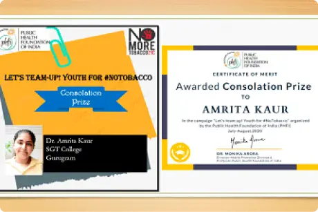 It is indeed a step of success for Dental Public health endeavours at Faculty of Dental Sciences, SGT University and a huge moment for our undergraduate students Aishley Jain & Amrita Kaur who individually won consolation prizes at the social campaign, âLets Team up! #NoTobaccoâ. Public Health Foundation of India (PHFI) team, in association with the World Health Organization, Country Office for India, conducted webinar on tobacco control policies to identify tobacco violations on social networking sites. Almost over 50 postgraduates and undergraduates attended the webinar and participated in the final competitions where an overwhelming response was received from the youth, and the organisers received more than 1000 posts from different social networking sites as competition entries. Amrita Kaur and Aishley Jain won prizes for their efforts at the competition. The whole activity was coordinated by Dr. Shourya Tandon from department of Public Health Dentistry and Dr. Varun Arya as part of ongoing collaborations with PHFI at our end.