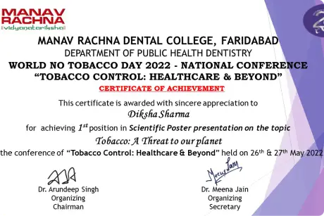 Diksha Sharma BDS III Year student under the guidance of Dr. Charu Khurana participated in UG Poster competition category at World No Tobacco Day Conference organized by Manav Rachna Dental College Faridabad on 26th-27th May 2022 and won 1st Prize in her category for scientific poster titled Tobacco: A threat to our environment