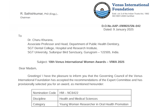 Dr. Charu Khurana (Associate Professor & Head) has been honored with the Young Woman Researcher Award by the Venus International Foundation on January 9, 2025. This award acknowledges her exceptional dedication and contributions to research in public health dentistry, reinforcing her commitment to advancing scientific knowledge in the field.