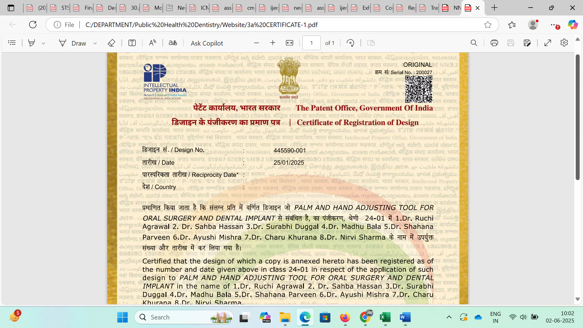 Dr. Charu Khurana got her design patent published on Palm and Hand Adjusting Tool for Dental Implant on 22/05/2025.