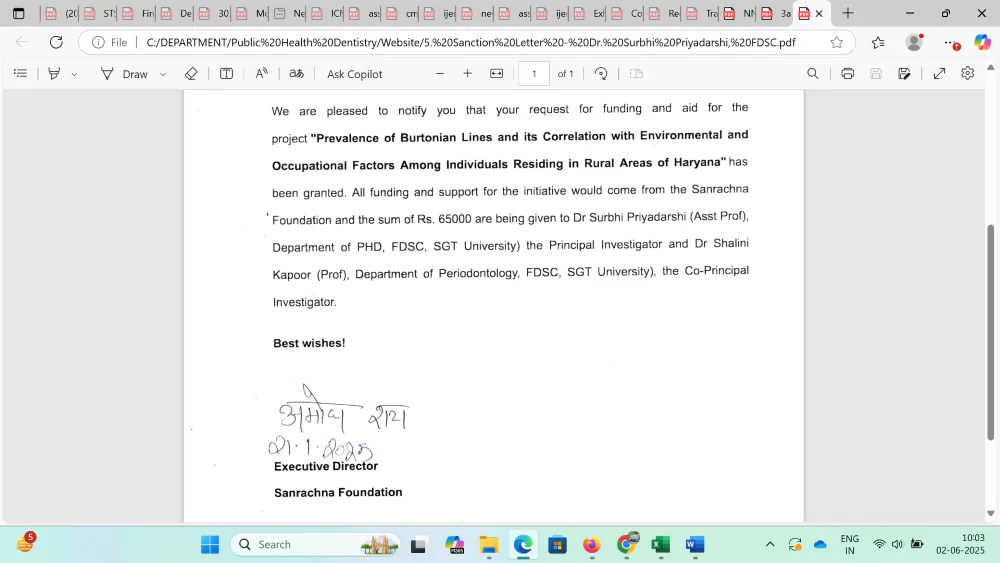 On January 24, 2025, Dr. Surbhi Priyadarshi (Assistant Professor) and Dr. Rangoli Srivastava (Assistant Professor) were awarded an Intramural Grant by the Sanrachna Foundation for their research project titled "Prevalence of Burtonian Lines and Its Correlation with Environmental and Occupational Factors Among Individuals Residing in Rural Areas of Haryana." This study aims to explore the health implications of environmental and occupational exposure on oral and systemic health, particularly in underserved populations.