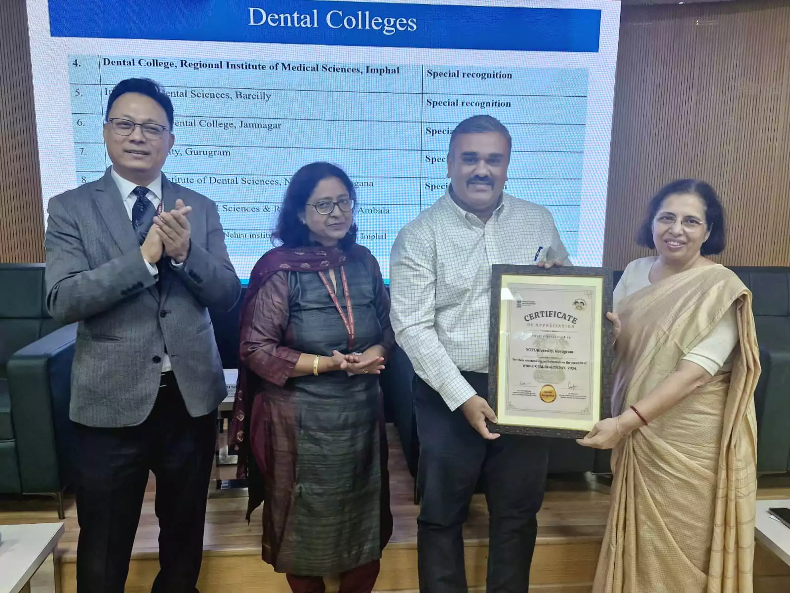 A Special Recognition was awarded to SGT University by the National Oral Health Program, Ministry of Health & Family Welfare, Government of India for World Oral Health Day Celebrations 2024. Ms. Vandana Jain, Joint Secretary, MoHFW, Dr. L Swasticharan, Addl. DDG, Dte. GHS, MoHFW and Dr. Ritu Duggal, Chief CDER, AIIMS presented the award to SGT Dental College, SGT University, Gurugram at the Inauguration of 4th National Steering Group Meeting & Felicitation ceremony of World Oral Health Day on 12th November 2024 at NaRRIDS, AIIMS-Delhi.