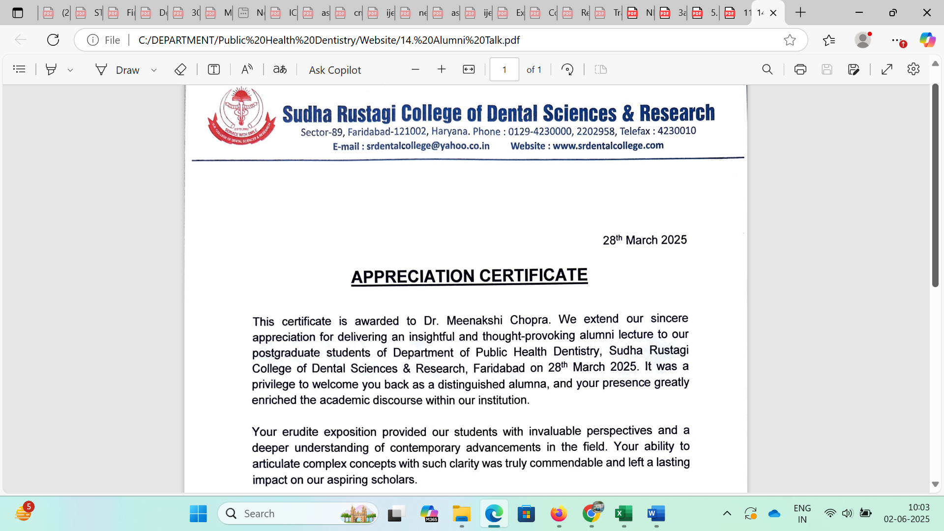 Dr. Meenakshi Chopra delivered Alumni Talk at Sudha Rustagi Dental College, Faridabad on 28th March 2025