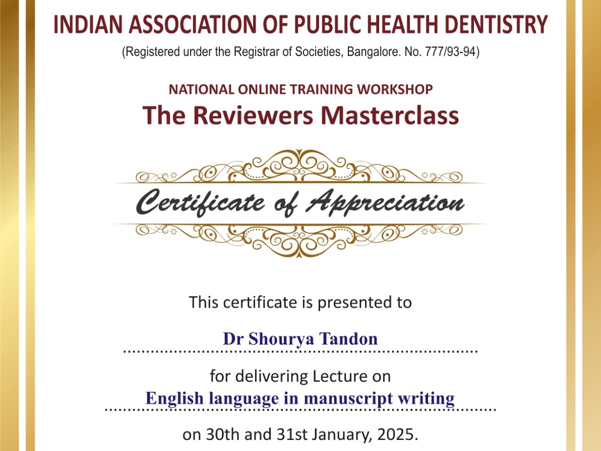 Dr. Shourya Tandon (Professor) played a pivotal role in promoting academic excellence by serving as a guest speaker at The Reviewers Masterclass â 1st Online Training Workshop for Reviewers organized by the Indian Association of Public Health Dentistry (IAPHD) on January 31, 2025. His session on "English Language in Manuscript Writing" provided valuable insights to aspiring researchers and reviewers, helping them enhance their academic writing skills.