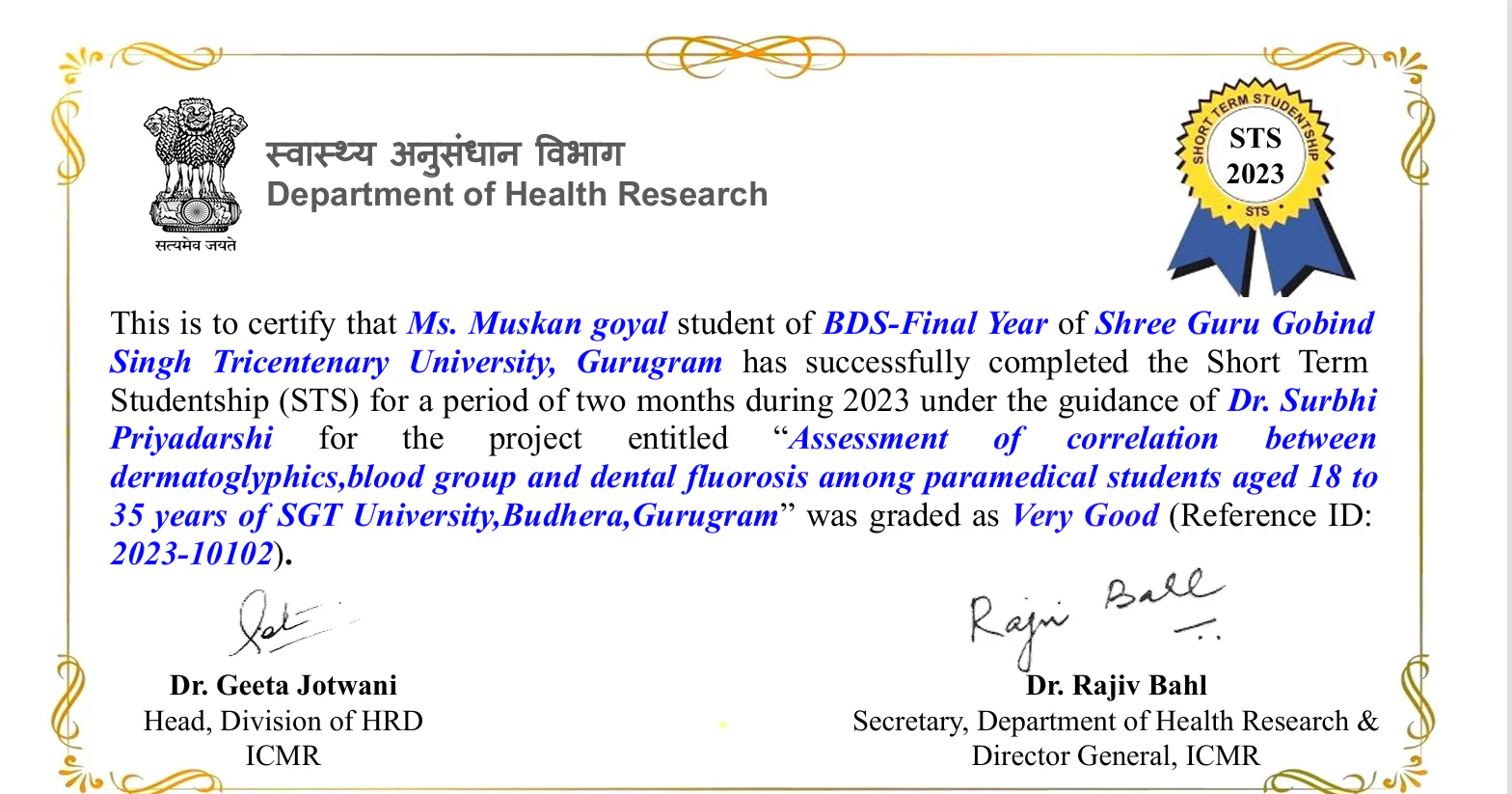 Ms. Muskan goyal student of BDS-Final Year successfully completed the Short Term Studentship (STS) for a period of two months during 2023 under the guidance of Dr. Surbhi Priyadarshi for the project entitled âAssessment of correlation between dermatoglyphics, blood group and dental fluorosis among paramedical students aged 18 to 35 years of SGT University, Budhera,Gurugramâ and was graded as Very Good (Reference ID: 2023-10102).