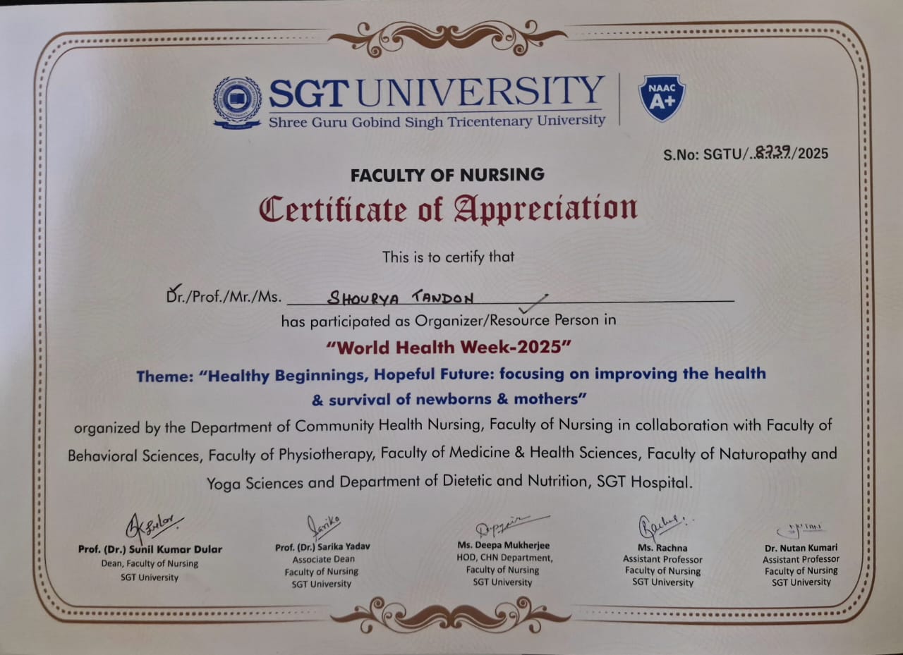 Invited as Resource Person at World Health Week 2025 Celebrations by Faculty of Nursing, SGTU