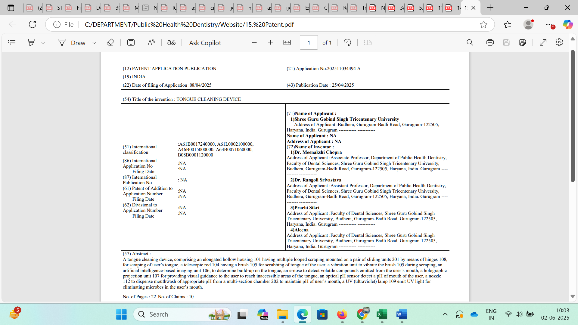 Dr. Meenakshi Chopra, Dr. Rangoli Srivastava, and students Prachi Sikri and Aleena have earned recognition for their creativity and hard work. They received a patent from the Patent Office of the Government of India for their "Tongue Cleaning Device" invention. The application for the patent was officially submitted with the number 202511034494. This achievement highlights the team's dedication to developing healthier oral hygiene tools and brings attention to their innovative approach to dental care.