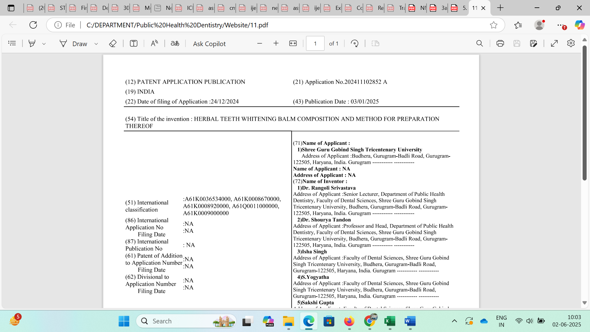 Dr. Rangoli Srivastava (Assistant Professor), along with Dr. Shourya Tandon (Professor)and a team of undergraduate studentsâ Isha Singh, Yogyatha, Sakshi Gupta, and Shaily Sharmaâhas successfully filed a patent titled "Herbal Teeth Whitening Balm Composition and Method for Preparation Thereof." The patent, filed under Application Number 202411102852 represents a groundbreaking innovation in natural oral care. This milestone published on January 15, 2025, underscores the departmentâs commitment to pioneering research in herbal dentistry.