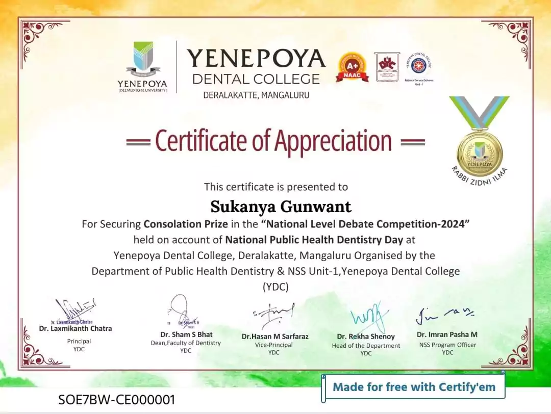 Ms. Sukanya Gunwant was awarded Consolation Prize in the National Level Debate Competition â 2024 held on the account of National Public Health Dentistry Day i.e. 19th June 2024 by Yenepoya Dental College, Mangaluru.
