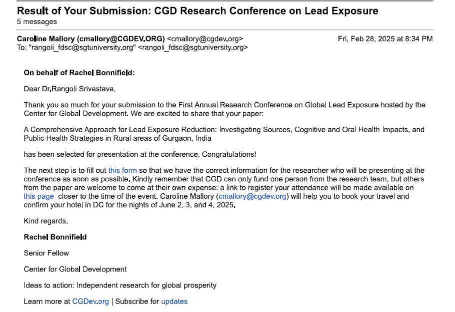 Dr. Rangoli Srivastava (Assistant Professor) has also received an Extramural Grant from the Centre for Global Development, USA, to attend the First Annual Research Conference on Global Lead Exposure from June 2-4, 2025. This grant, awarded on March 3, 2025, highlights her dedication to addressing global environmental health challenges through research and collaboration.