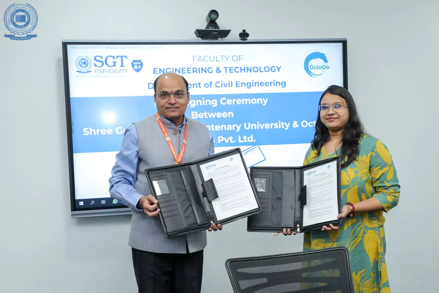 SGT University (School of Engineering & Technology, Department of Civil Engineering) signed an MoU with OctoDo Solutions Pvt. Ltd., on 25 April 2025, marking a significant step toward integrating Artificial Intelligence and Machine Learning in Civil Engineering education and research. This collaboration aims to equip students with AI-driven tools and skills for smarter infrastructure design, construction, and management. The partnership will offer hands-on training, joint research projects, and internships focused on real-world applications of AI & ML in the civil domain. This strategic alliance reinforces SGTU’s commitment to industry-oriented, future-ready education.