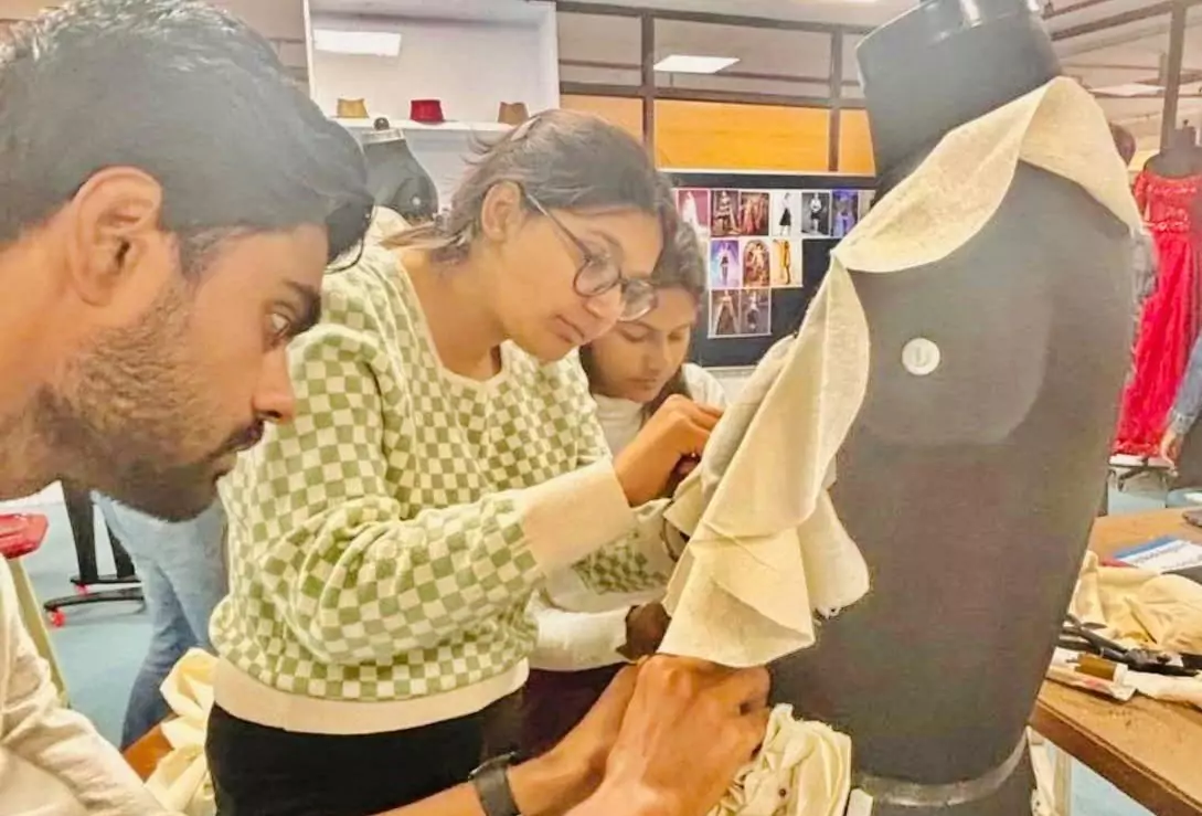 With every fold, tuck, twist, and pleat, the students unleashed their creativity, transforming plain fabrics into dramatic, wearable art. The hands-on session allowed students to experiment freely, learning to work with the natural fall, texture, and behavior of different fabrics.