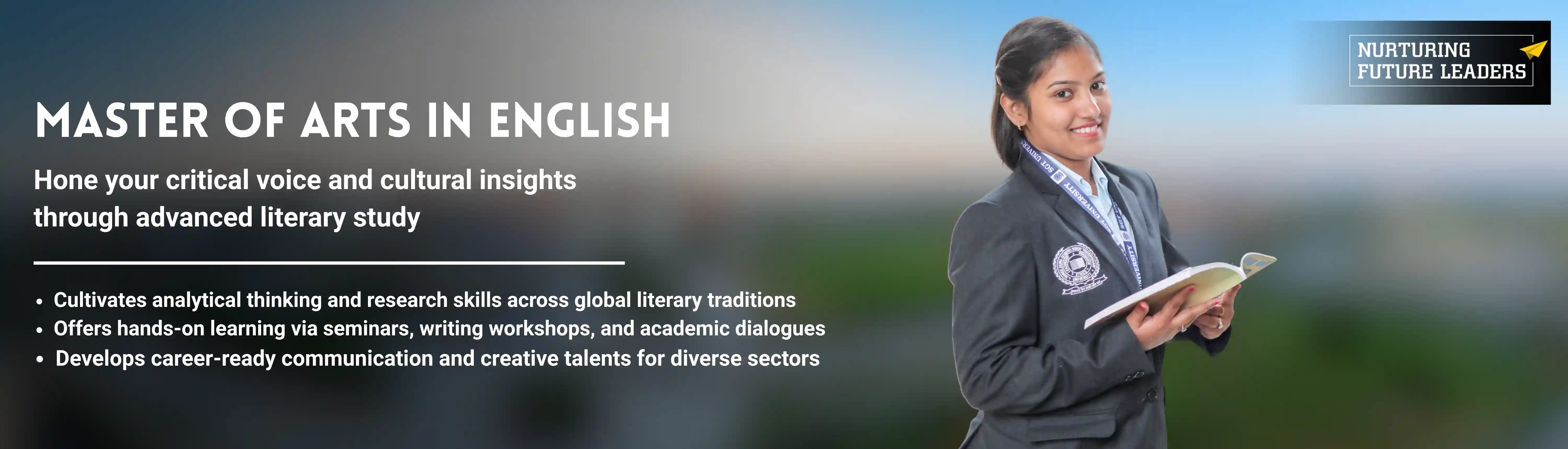 The Master of Arts in English at SGT University, Gurgaon, is a two-year postgraduate degree studying English literature and language globally. It helps students develop analytical and critical thinking skills to provide innovative ideas in scholarly academic writing and discourse. The syllabus promotes essential literary ideas, tendencies, and trends in English literature that cut across genres, periods, and cultural boundaries.