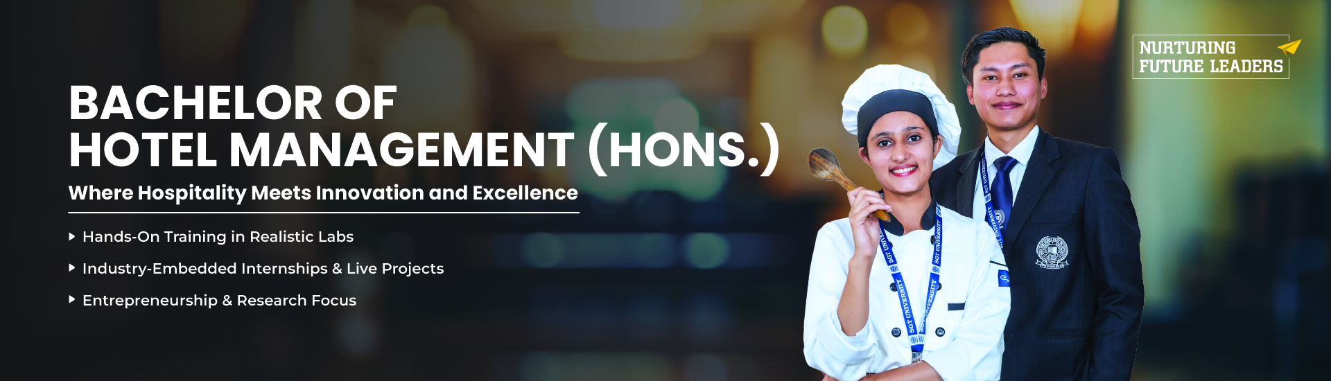 The Bachelor of Hotel Management (Hons.) is a four-year program designed to equip students with comprehensive hospitality skills and hands-on industry experience. The curriculum covers food production, front office operations, housekeeping, and event management, ensuring students gain operational and managerial expertise. Training occurs in state-of-the-art professional kitchens, practice restaurants, and hotel simulation labs, providing real-world exposure. Students also benefit from guest lectures, workshops, and live projects, making them industry-ready.