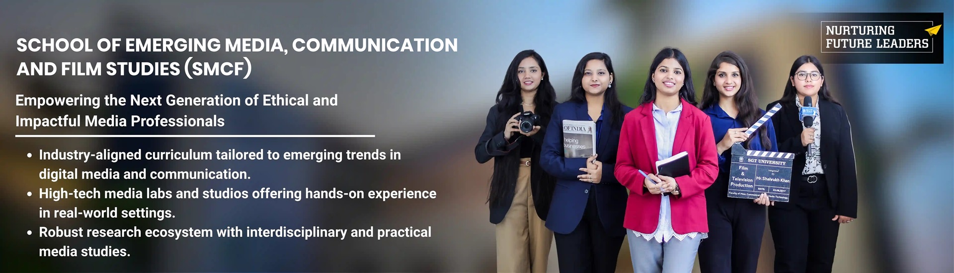 The School of Emerging Media, Communication and Film Studies (SMCF) at SGT University, Gurugram, is a leading institute for journalism, digital media, advertising, and public relations education. Established in 2014, SMCF offers top-ranked programs including a BA in Journalism and Mass Communication (BAJMC), a Master of Arts in Journalism and Mass Communication (MAJMC), and a PhD in Journalism and Mass Communication, equipping students with the skills needed to thrive in the fast-paced media industry.