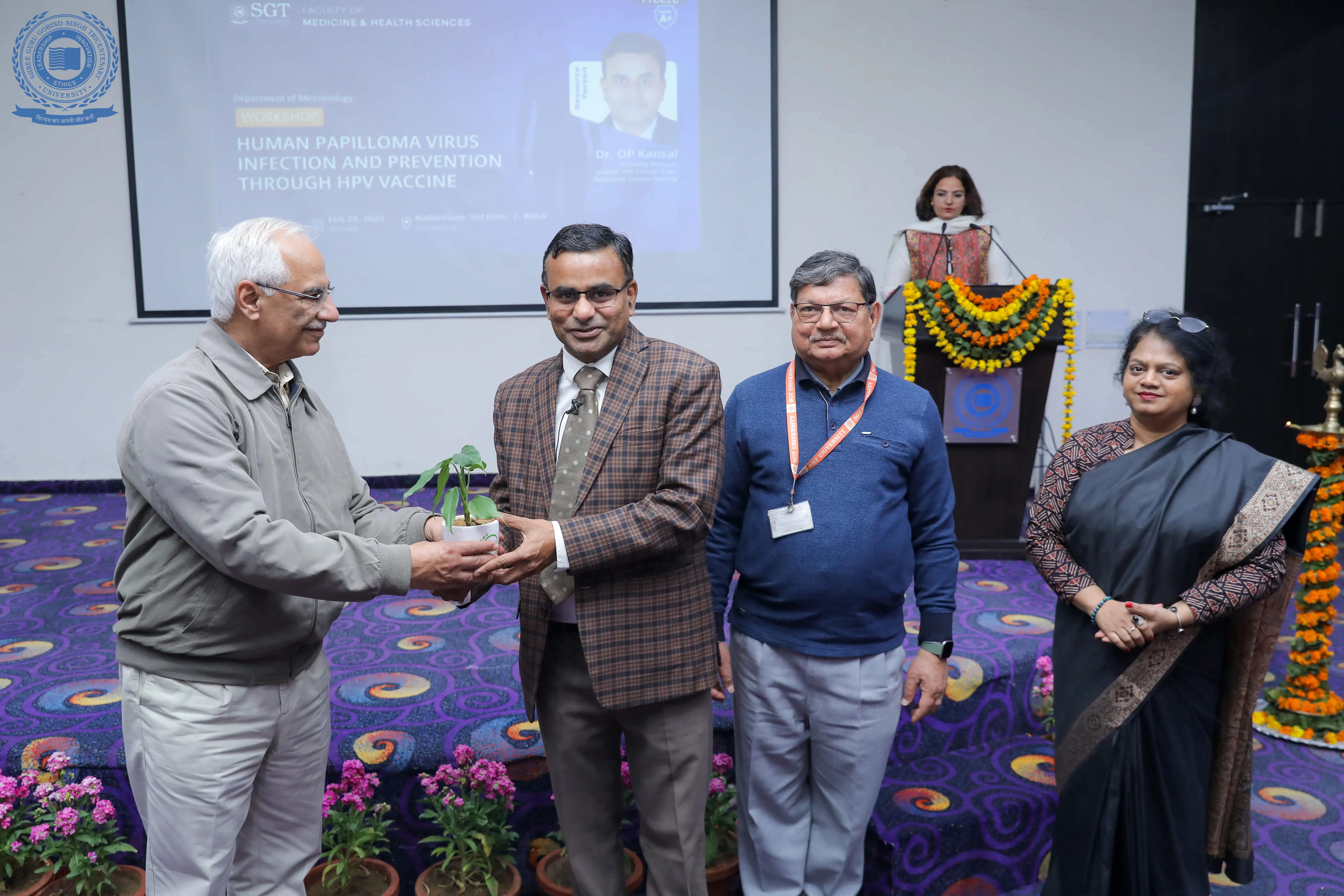 A CME on “Human papilloma virus infection & prevention through HPV vaccine” was organized by Department of Microbiology, FMHS, SGT University on 29 th February 2024. Dr. Om Prakash (OP) is a public health professional currently working as a Country Advisor-India, American Cancer Society was the guest speaker. Dr. Rajeev Sen, HOD Pathology; Dr Jasveer Malik, HOD Community medicine; Dr Wadhva, HOD Obstetrics & Gynecology; Dr Bhattacharya, Emeritus professor Obstetrics & Gynecology ; many other faculty members of SGT medical college & hospital graced the event.