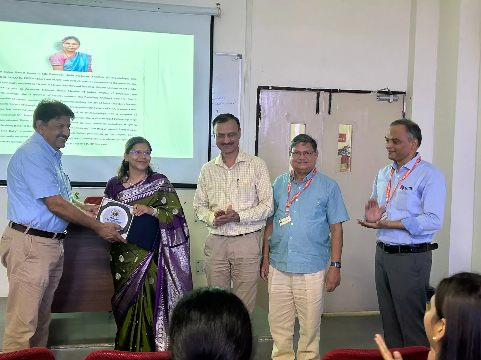 The subject expert speaker, Dr. Nalini Bansal Gupta is a renowned expert in pathology with over 18 years of experience in histopathology. She's a gold medalist in MD Pathology and has received the UICC Technical Fellowship at Queen Elizabeth Hospital Birmingham University. Dr. Gupta has published numerous papers and is an associate editorial board member of the Indian Journal of Pathology and Microbiology. She was introduced to the audience by Dr Rajeev Sen, HOD Pathology, FMHS.