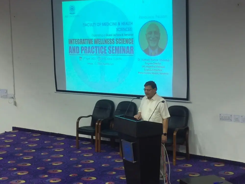 Integrative wellness science and practice seminar “was organized by Association of Pathology of FMHS on 17th April ,1000hr onwards. The seminar was attended by all the faculty members, PG students and students from department of pathology, Faculty of Naturopathy, and yogic sciences (FNYS) and Indian medical system. The seminar was conducted by Dr Sushil K Sharma, Glen Burnie MD, MRCP, FACC, PCRM, ASPC, Ex president Maryland Heart Association and currently programme director IWS Integrative Wellness Science and Practice Rama Krishna Mission Haridwar. The workshop was graced by Dr Shyam Singla (Advisor to SGT University), Dr Reena Nayyar (Executive Director), Dr SPS Kochar (Dean FMHS), and all HODs from FMHS.