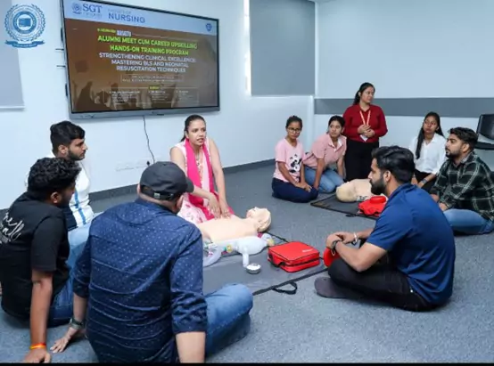 Alumni Meet cum Career Upskilling Hands-On Training Program on 29th June 2024 at the National Reference Simulation Centre (NRSC) organised by the Faculty of Nursing at SGT University, Gurugram. The primary objective of this training was to underscore the critical importance of Basic Life Support (BLS) and Neonatal Resuscitation in emergency management. It was a significant initiative aimed at enhancing professional competence and ensuring alumni readiness to handle critical medical emergencies with proficiency and confidence.