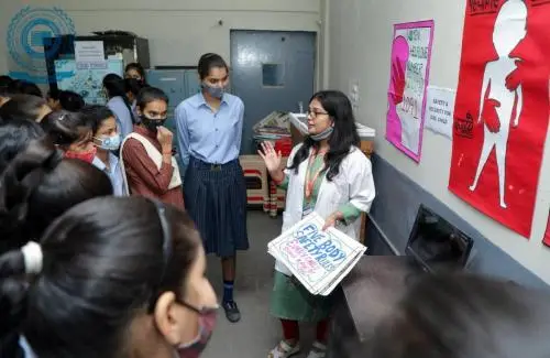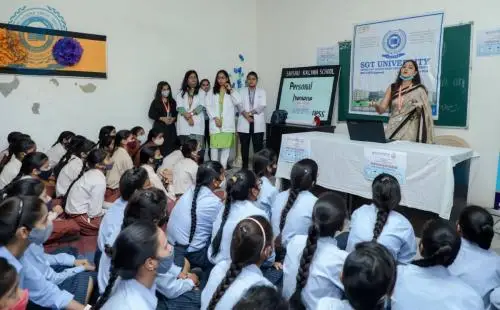 Department of Obstetrics and Gynaecological Nursing, Faculty of Nursing, SGT University, Gurugram has organized a Seminar cum student interactive session on Personal Hygiene and Healthy life style among Adolescent at Shishu Kalyan School, Sector 86, Gurugram on 22nd October 2021.The session was conducted by Ms. Shalu, Assistant Professor, Faculty of Nursing, and SGT University. The main objective of the session was to create awareness regarding Basic personal Hygiene, Menstrual cycle, Menstrual Hygiene and alternative therapies used during menstruation or other disorders like Vaginal Discharge, PCOD, Sexually transmitted disease their prevention, Management and their future consequences in their reproductive life with the help of team Members Ms. Geetanjali, Ms. Banapriya and Ms. Sonam and Msc. Nursing students through demonstrating the procedure on Menstrual Hygiene and alternative Therapies, Breast self examination, Healthy diet and also informing the students about women Help Line Number for girl’s and women’s safety.