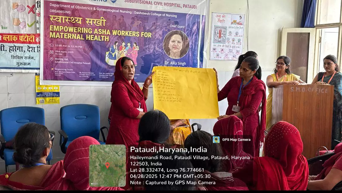 The Department of Obstetrics & Gynecological Nursing, Faculty of Nursing, and Dashmesh College of Nursing, SGT University, in collaboration with Subdivisional Civil Hospital, Pataudi, organized a one-day workshop, “Swasthya Sakhi: Empowering ASHA Workers for Maternal Health,” on 28th April 2025 at Subdivisional Hospital, Pataudi.